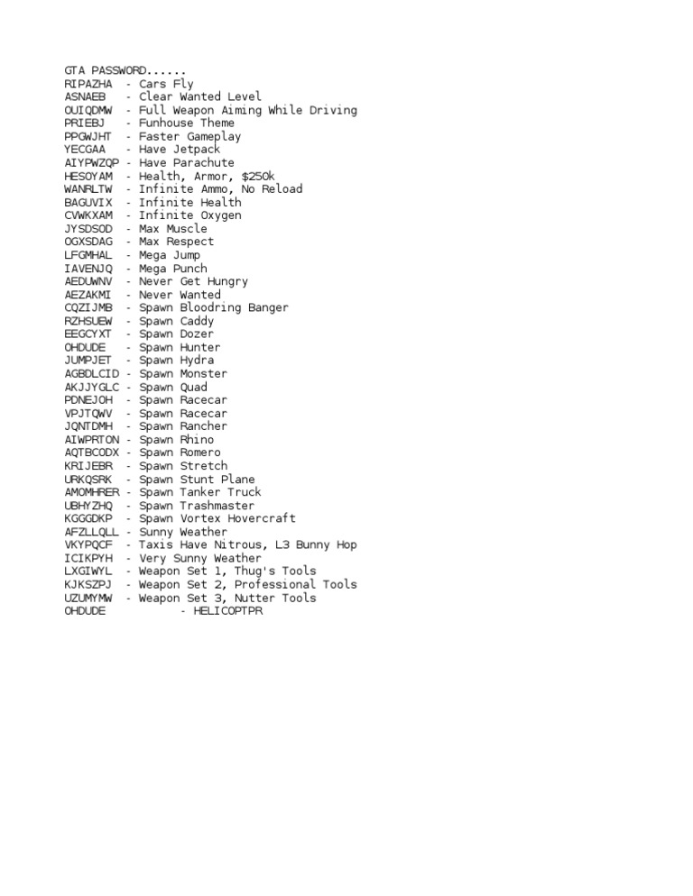 Grand theft auto cheats: vice city (gta vice city) for pc, ps2 and xbox posted on february 10, 2020 february 17, 2020 author layla adams comment(0) here are a series of tips and tricks from grand theft auto: vice city for pc and that will definitely make the game much easier. The mobile versions of gta vice city were released during 2013 as a 10 year anniversary edition. while the official line is that there are no cheats in the game, there is a way to input the pc cheats into the gta vice city android and iphone versions of the game if you can somehow attach a keyboard or install some kind of keyboard app that lets you type during gameplay.. Gta vice city pc cheats for money latest all download. gta vice city all cheats. weapon set 1 thugstools. weapon set 2 professionaltools. weapon set 3 nuttertools. full health aspirine. full armor preciousprotection. ladies’ man fannymagnet. increase wanted level youwonttakemealive..